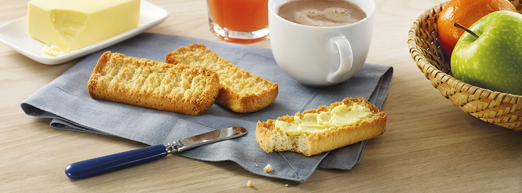 Le mot français "Biscotte" signifie "deux fois cuite". Cuire deux fois lui donne un goût croustillant et appétissant. La biscotte est un type de pain grillé fabriqué à partir de pain frais français et peut être utilisée à différentes fins.